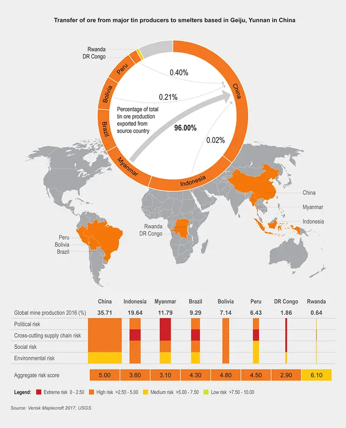 Scénarios d'approvisionnement en 3TG : les ensembles de données de Verisk Maplecroft révèlent les risques « cachés » de la chaîne d'approvisionnement. Dans son évaluation de 20 problèmes clés en matière de droits de l'homme et d'environnement liés à l'extraction de minéraux 3TG à l'échelle mondiale, Verisk Maplecroft identifie l'étain comme étant le minéral 3TG présentant le risque le plus élevé de violations des droits du travail. En dehors de la République démocratique du Congo, le travail des enfants présente un « risque extrême » dans trois des huit plus grands pays producteurs d'étain – la Bolivie, le Myanmar et l'Indonésie – tandis que cinq sont également identifiés comme « à haut risque » de travail forcé, dont la Chine et le Pérou. La recherche souligne que l'esclavage au Brésil et en République démocratique du Congo présente un « risque extrême » pour les chaînes d'approvisionnement.